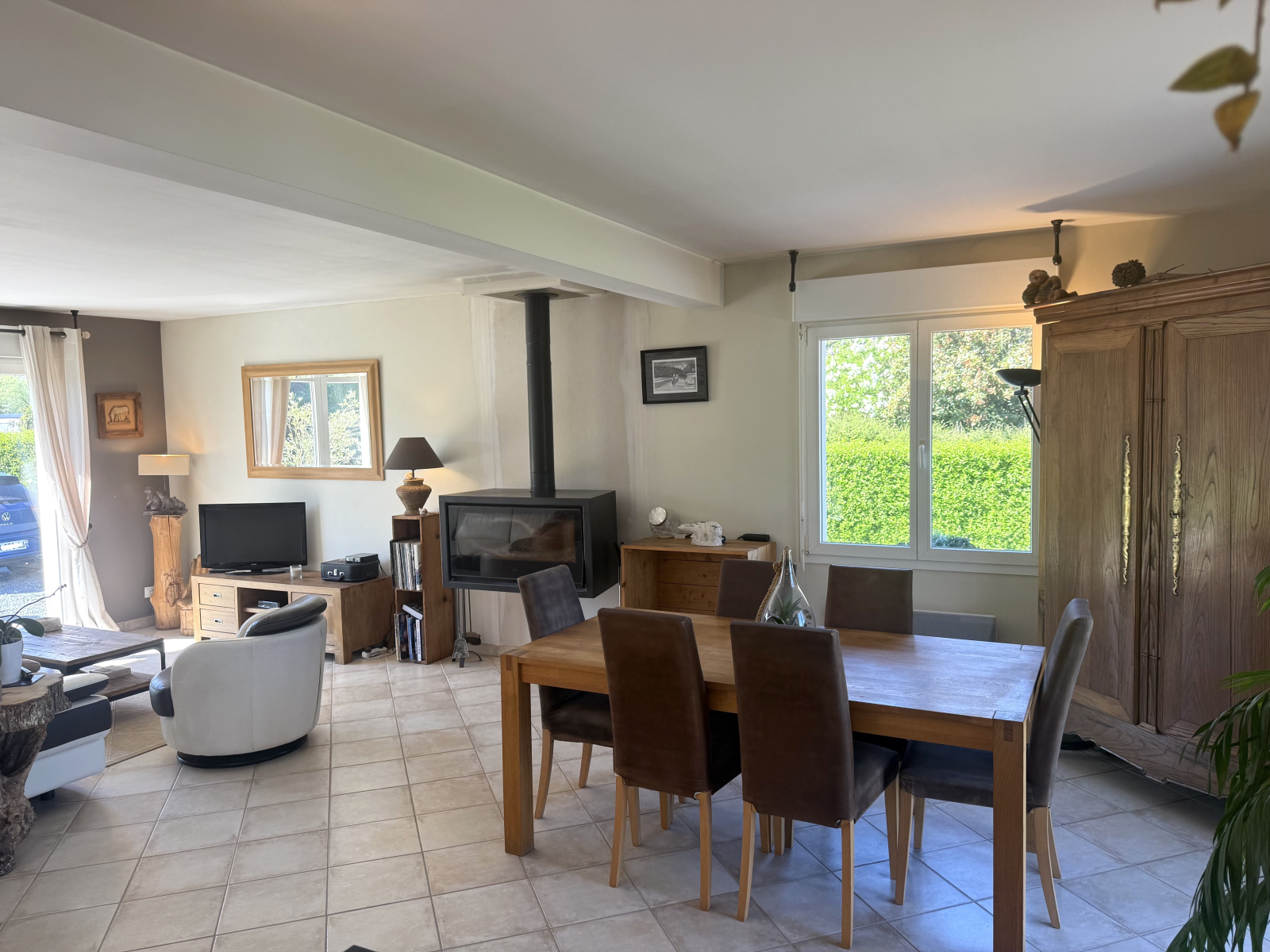 Le rez-de-chaussée vous offre une cuisine aménagée et équipée ouverte sur un grand séjour avec un poêle à bois pour une ambiance chaleureuse, une chambre avec placard et WC.